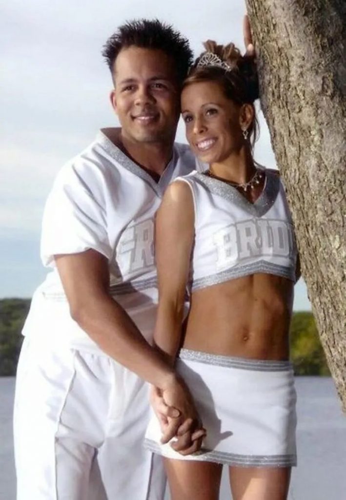 Behold, there is a wedding attire choice that defines “cool” like no other. The palpable chemistry between these lovebirds hints at a lifelong journey together, perhaps sparked by a high school romance. Their effortless camaraderie demands attention, leaving us to wonder if she once adorned the cheerleader uniform that inspired her unconventional bridal dress.
